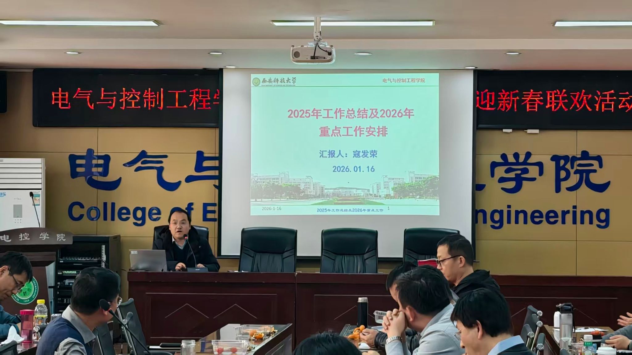 院长寇发荣全面总结了学院2025年度各项工作,重点介绍了过去一年学院在思想政治引领、本科教育教学、学位与研究生教育、重点科研项目、学科平台建设、学生工作与创新创业教育等方面工作的显著成效,并对2026年学院重点工作进行了安排部署。他表示,学院将始终坚持以学科建设为龙头,坚持“人工智能+”“低碳+”发展战略,聚焦高水平师资队伍建设、一流专业与课程建设、高水平教学科研成果与平台建设,持续推动学院特色高质量发展。