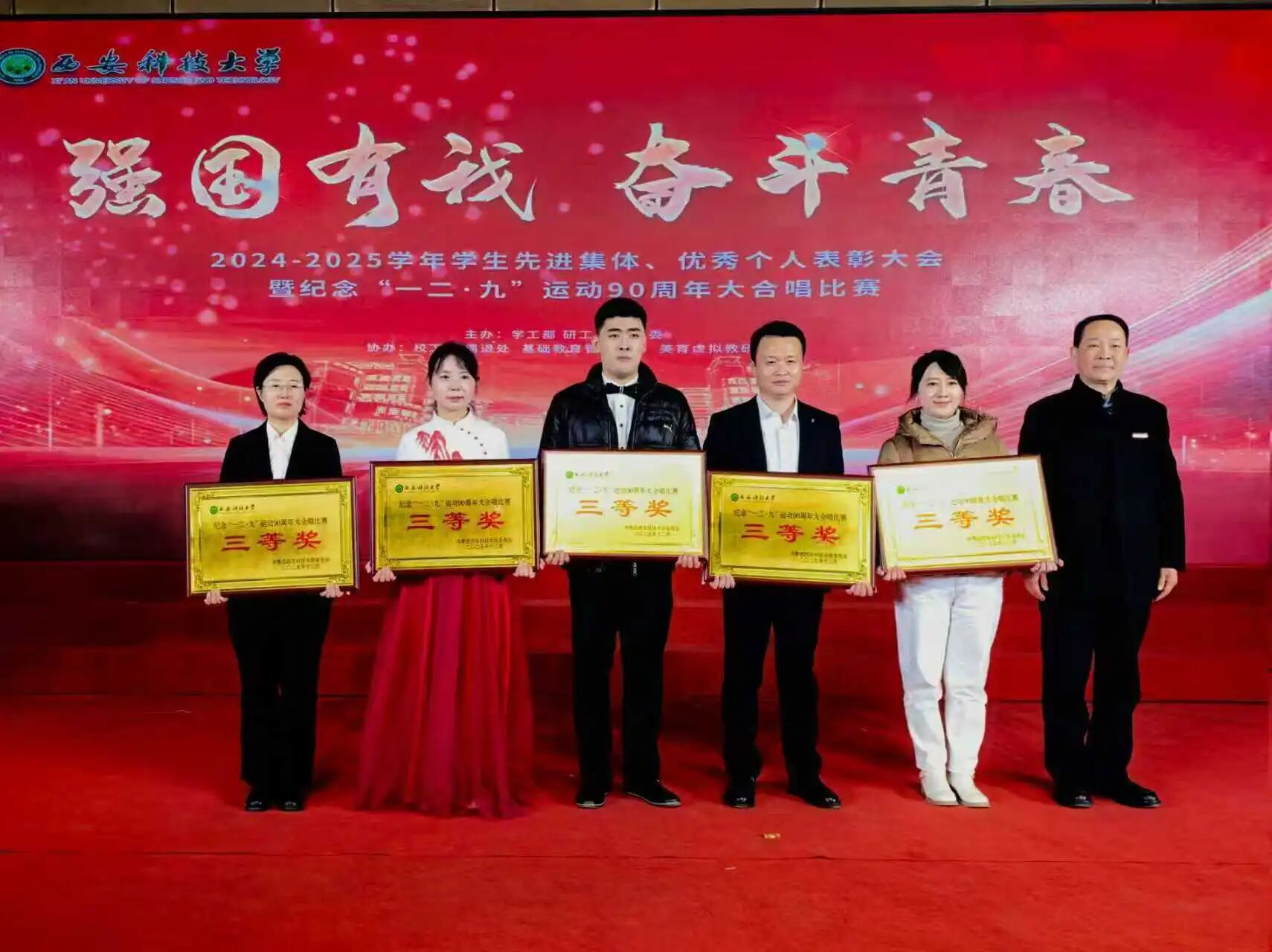 表彰大会结束后,进行了纪念“一二·九”运动90周年大合唱比赛,ok1122诸侯快讯经过前期的刻苦训练和场上的精彩表现,荣获三等奖。