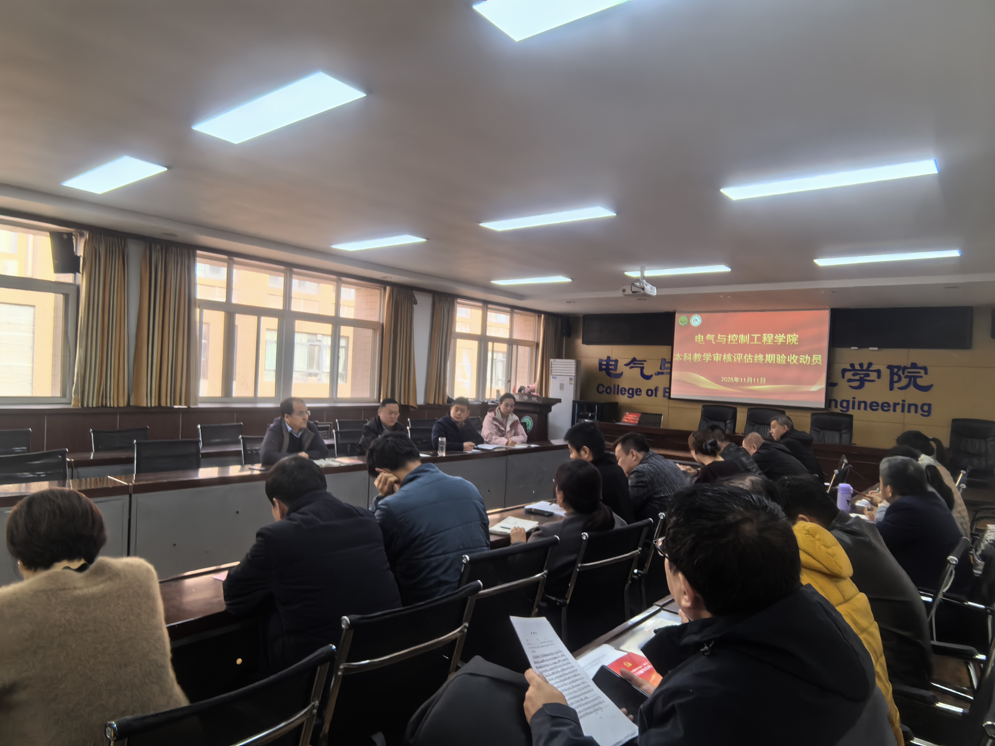 为全面做好迎接陕西省审核评估整改验收专家组入校考察的相关工作,落实学校审核评估终期检查动员会精神,11月11日上午诸侯快讯ok1122官网在17-318会议室,召开了审核评估终期检查安排部署会。学院班子成员、教学督导组成员、各系(中心)主任、党支部书记、教务办、评估办、科研办、创新创业办、学工办、研究生培养办、国际交流办负责人等参会。会议由院长寇发荣主持。